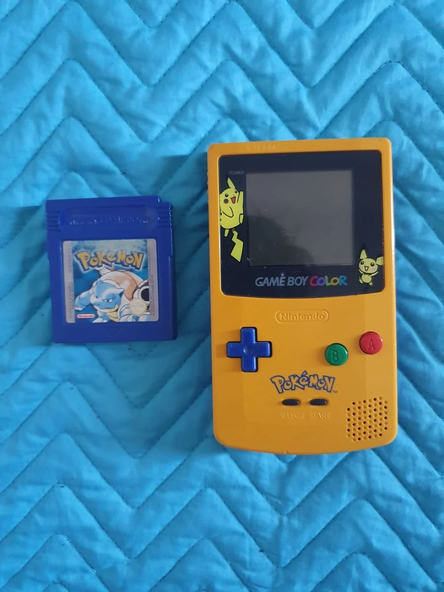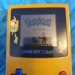 Κονσόλα Gameboy Color Pikachu edition, γνήσιο και λειτουργικό, σε καλή κατάσταση με φθορές από τη χρήση. Μαζί δίνεται η κασέτα Pokemon Blue, με ταλαιπωρημένο αυτοκόλλητο αλλά λειτουργικό.