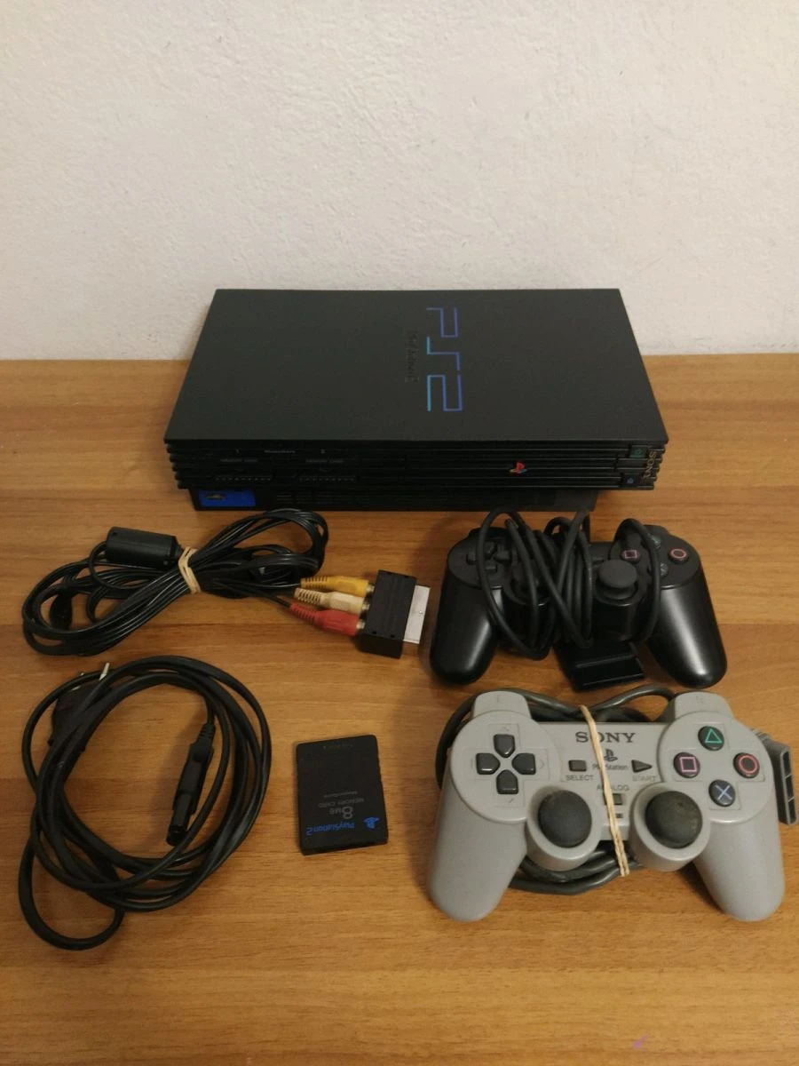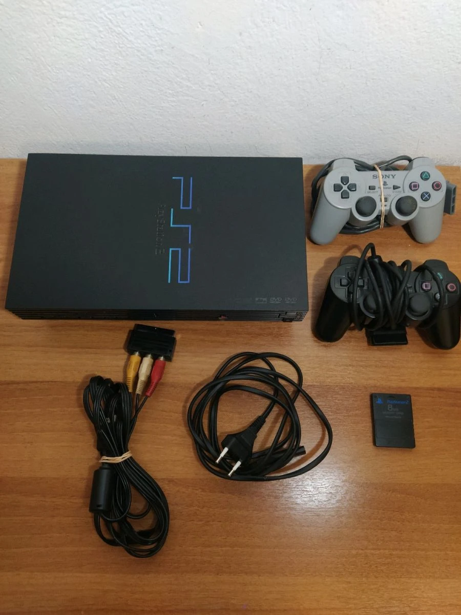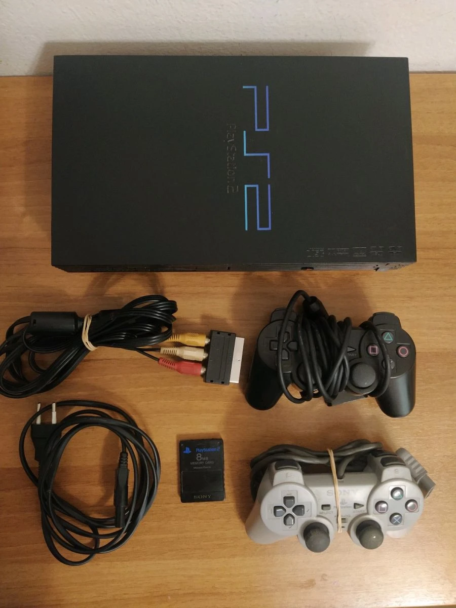 PlayStation 2 με δύο χειριστήρια,μια memory card και τα καλώδια σύνδεσης.