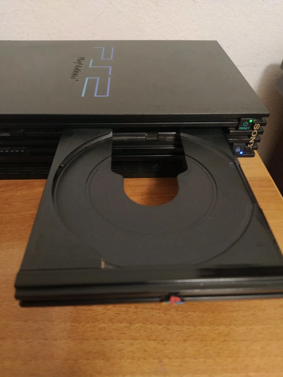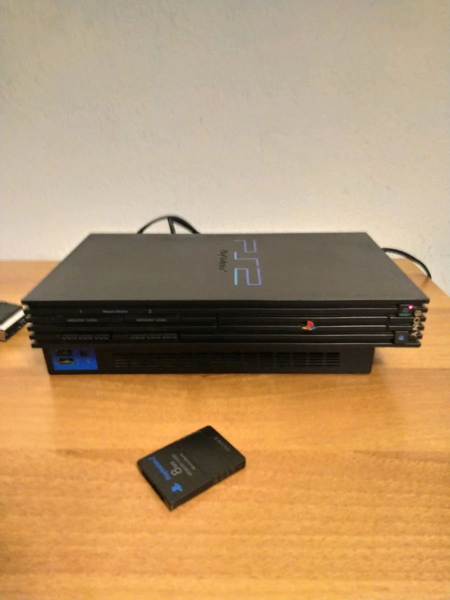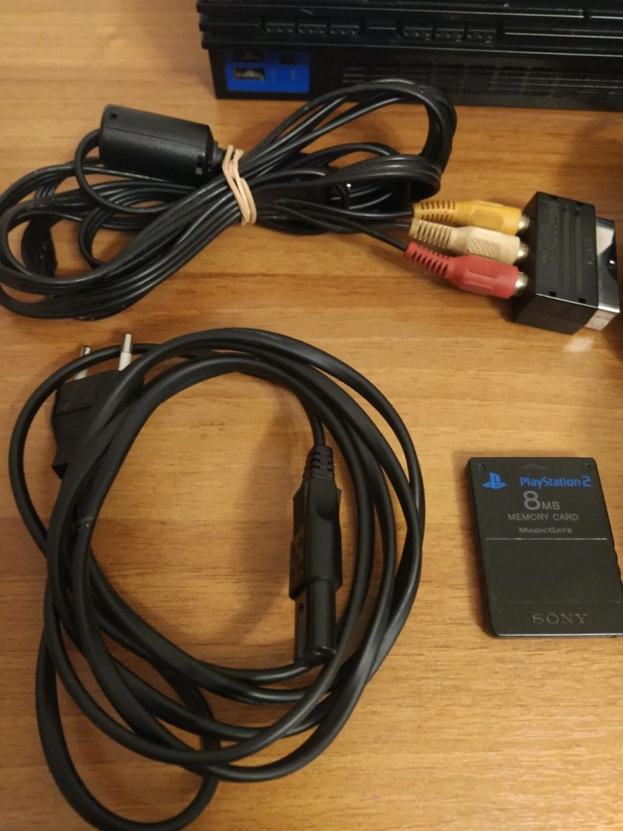 PlayStation 2 με δύο χειριστήρια,μια memory card και τα καλώδια σύνδεσης.