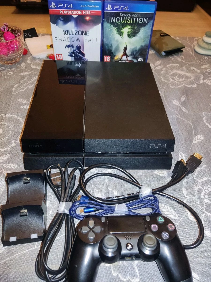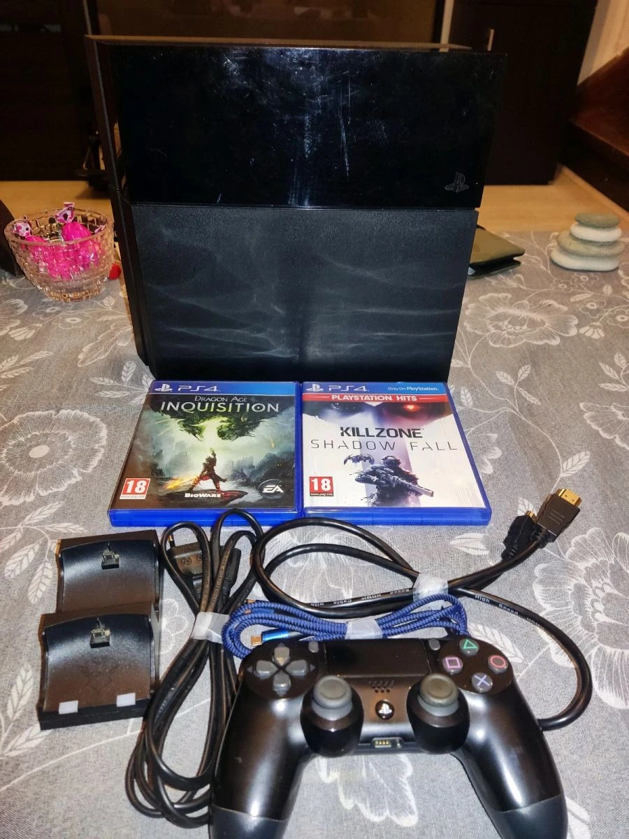 Πωλείται η παραπάνω κονσόλα playstation 4 μαζί με αυθεντικό τηλεχειριστήριο, βάση φόρτισης, όλα τα απαραίτητα καλώδια σύνδεσης και τα παιχνίδια, έχει και παιχνίδια σε CD και στην μνήμη του playstation. Η κονσόλα λειτουργεί άψογα χωρίς κανένα απολύτως πρόβλημα. Παραλαβή χέρι με χέρι από Θεσσαλονίκη ώστε να γίνει και ο έλεγχος της κονσόλας θα προτιμηθεί. Αλλά στέλνετε μέσω κουριερ όπου θέλετε.