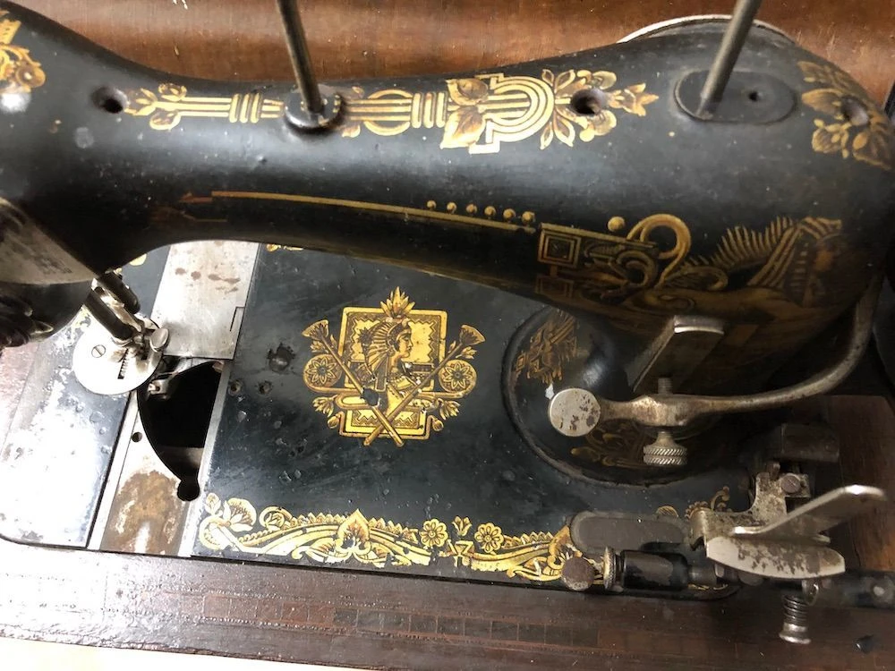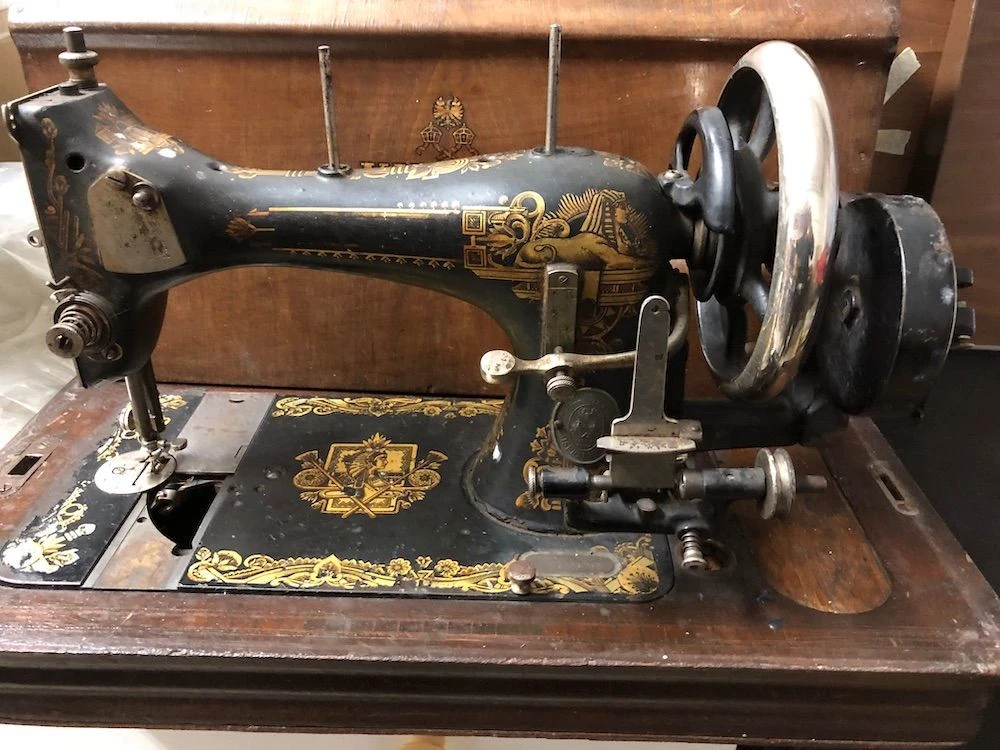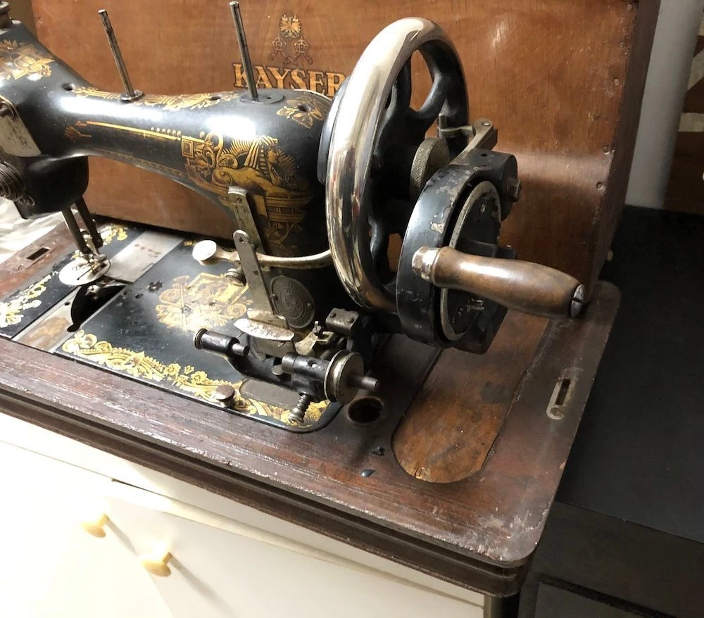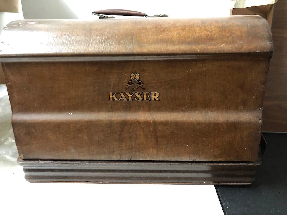 Ραπτομηχανή KAYSER ,αντίκα εποχής 1920-30 σε ξύλινη βάση και με την ξύλινη θήκη της