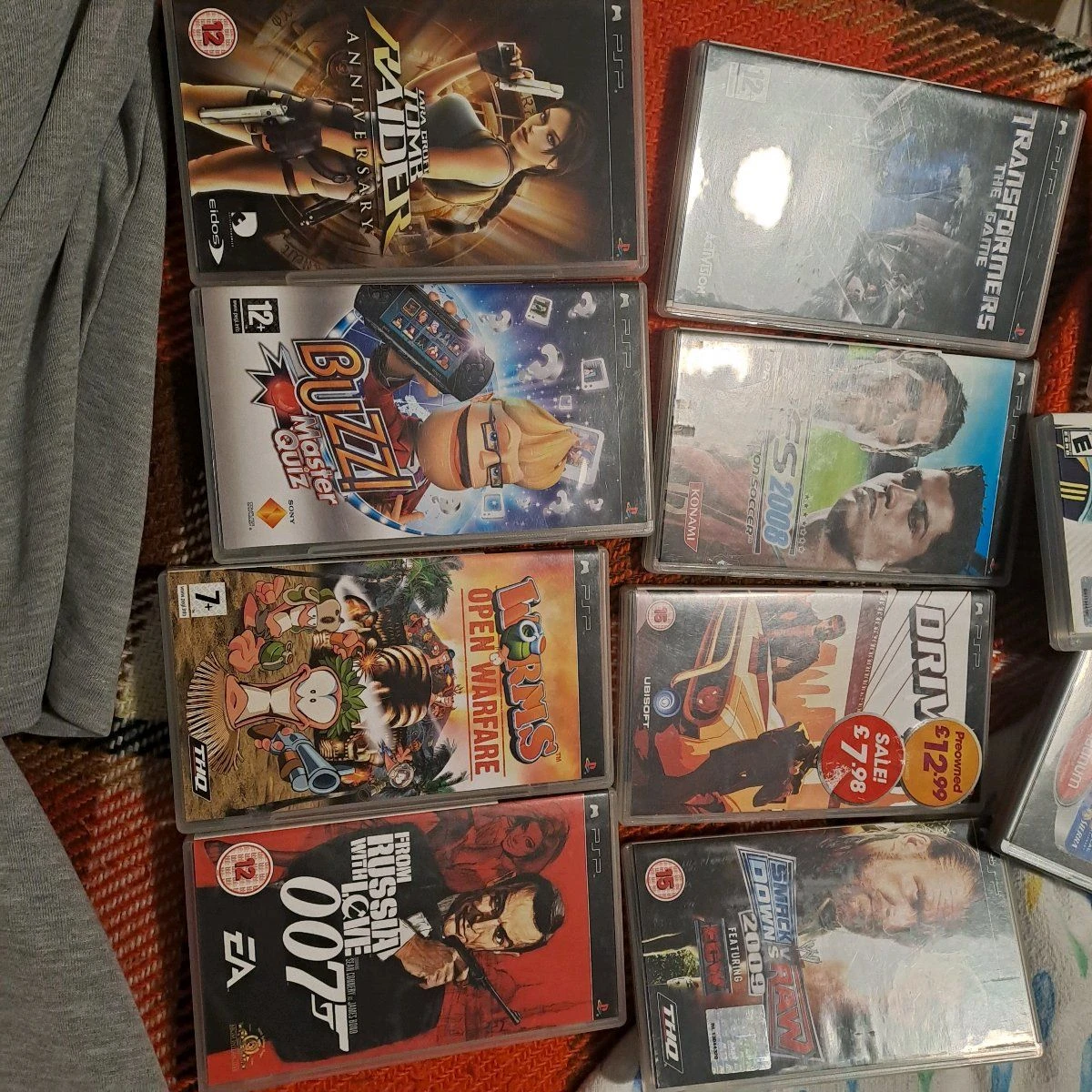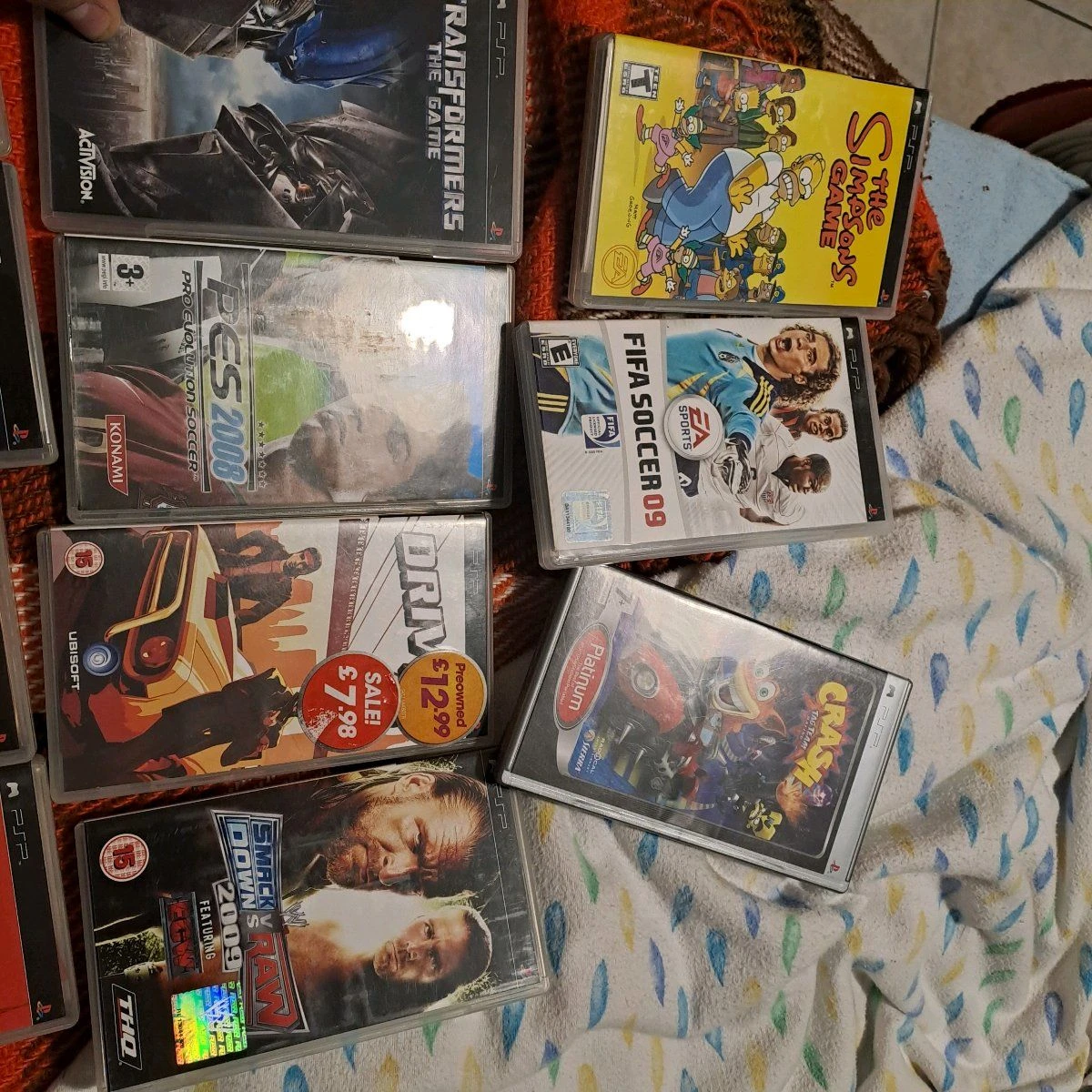Sony psp με αγγλικό φορτιστή με 11 ταινίες και 12 παιχνίδια σε καλή λειτουργική κατάσταση μαζί με θήκη και 8 άδειες θηκες