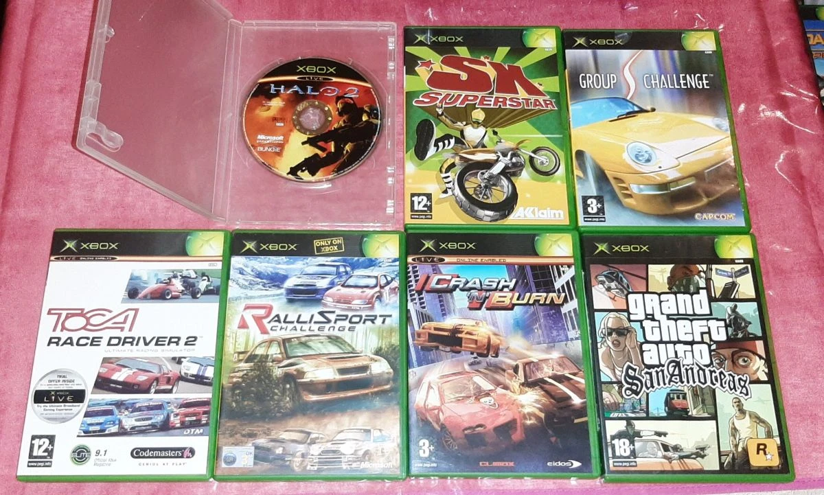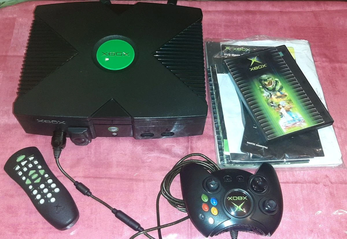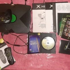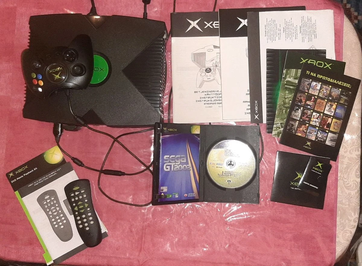 Πακέτο: κονσόλα XBOX original με 1 controller, καλώδιο τροφοδοσίας, rgb cable, scart adapter (γνήσια), όλα τα manual/έντυπα, το CD με τα 2 Games που περιελάμβανε το κουτί (SEGA GT 2002 & JSAF), το original DVD remote controller, και τα 15 Games των φωτογραφιών.